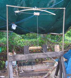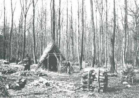 Pole lathe workers (bodgers) at work late 1800's showing a typical 'Hovel' for shelter Photo supplied by the late Barry Plant |
