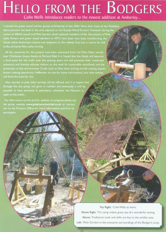 Colin featured on the front page of the Wheelbarrow Magazine, May issue. This publication is the in house magazine for the Amberley Museum and is distributed to all volunteers, supporters and staff at the museum also available to the public when visiting. Page 14 of the publication has photos and a brief write up about the green wood worker group, glade area and Hovel --- see below for a clearer copy of the write up. |